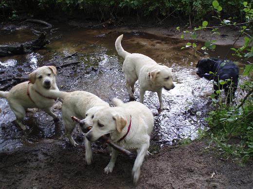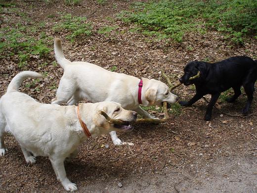 Während die Hunde um Stöcke kämpfen-,